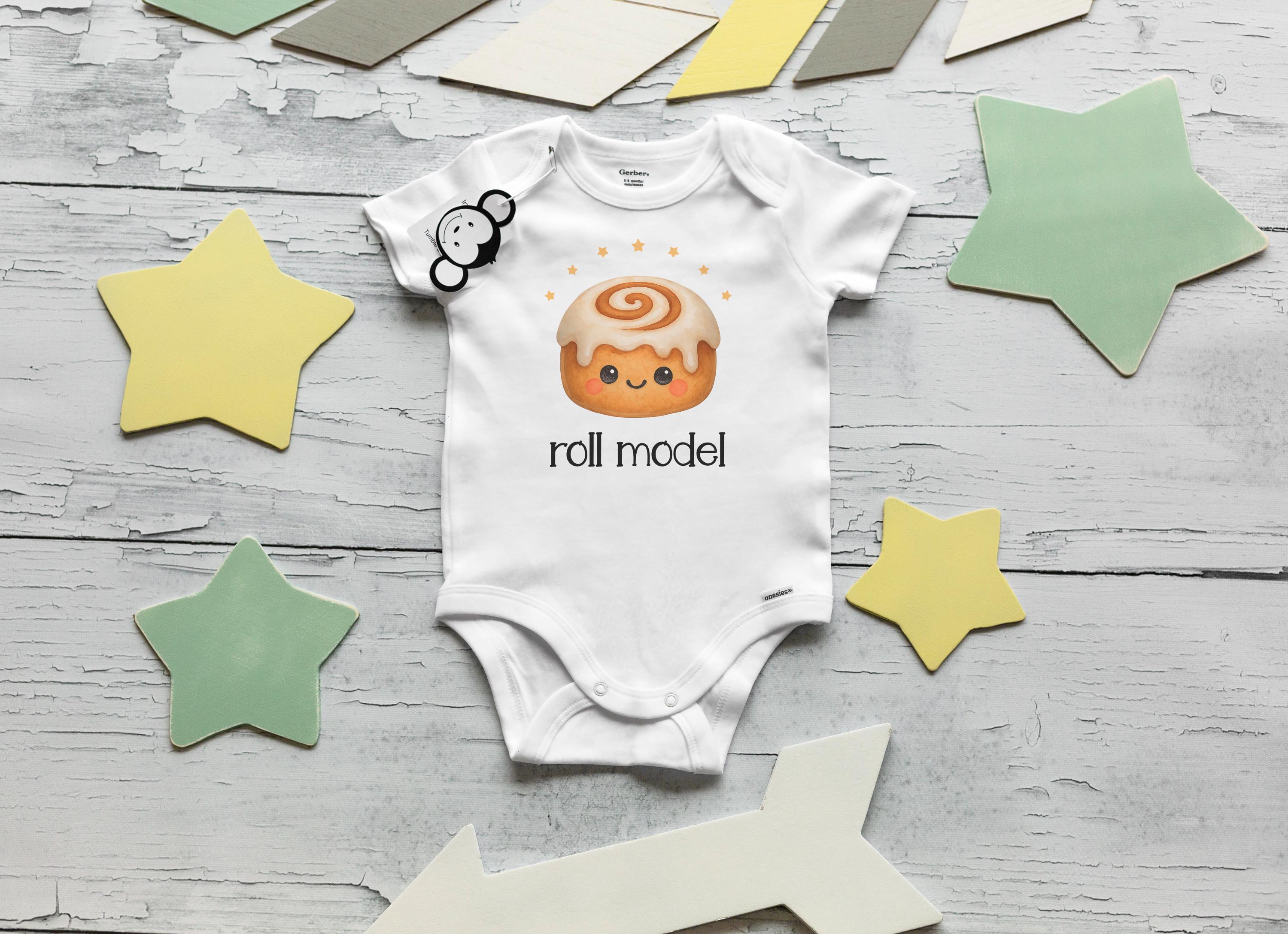 A cute food themed bodysuit with the word "Roll Model" printed across the front. This design features an adorable cinnamon roll and would make a great baby shower gift for a cinnamon roll lover. This adorable little design is guaranteed to bring smiles and laughs.